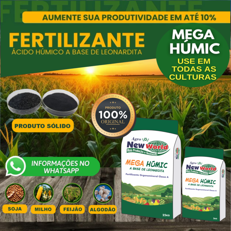 O fertilizante Mega Húmic, classificado como Organomineral Classe A, é uma fonte pura de ácidos húmicos e fúlvicos derivados da Leonardita, reconhecida mundialmente como a fonte mais concentrada.